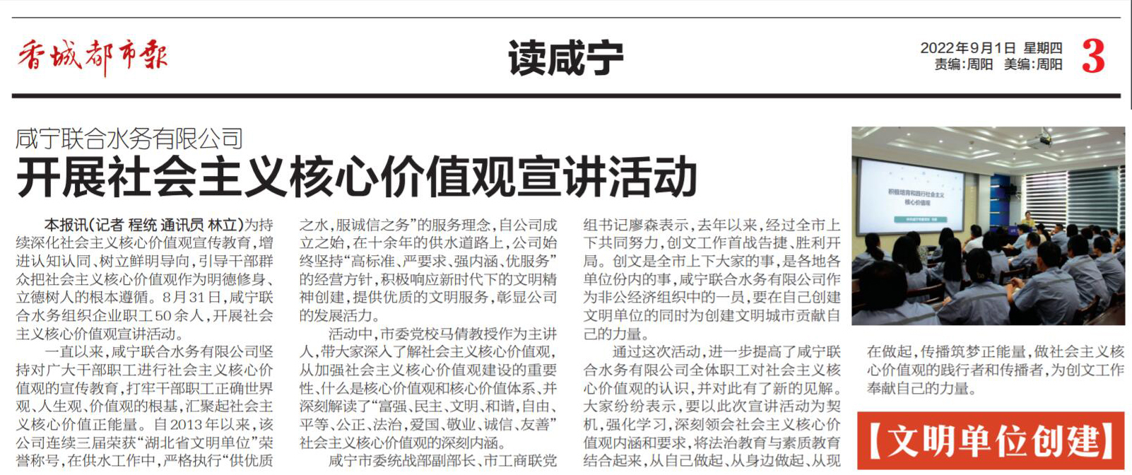 圖∶《香城都市報》刊登相關新聞 為進一步推進社會主義核心價值觀宣傳工作,提高公司職工精神文明素質。8月31日,咸寧聯合水務有限公司與中共咸寧市委宣傳部、咸寧市工商聯共同開展“社會主義核心價值觀宣講”活動。此次活動由市委黨校馬倩老師主講,咸寧市委統(tǒng)戰(zhàn)部副部長、市工商聯黨組書記廖森、咸寧聯合水務有限公司總經理毛雄輝等領導出席本次宣講活動。