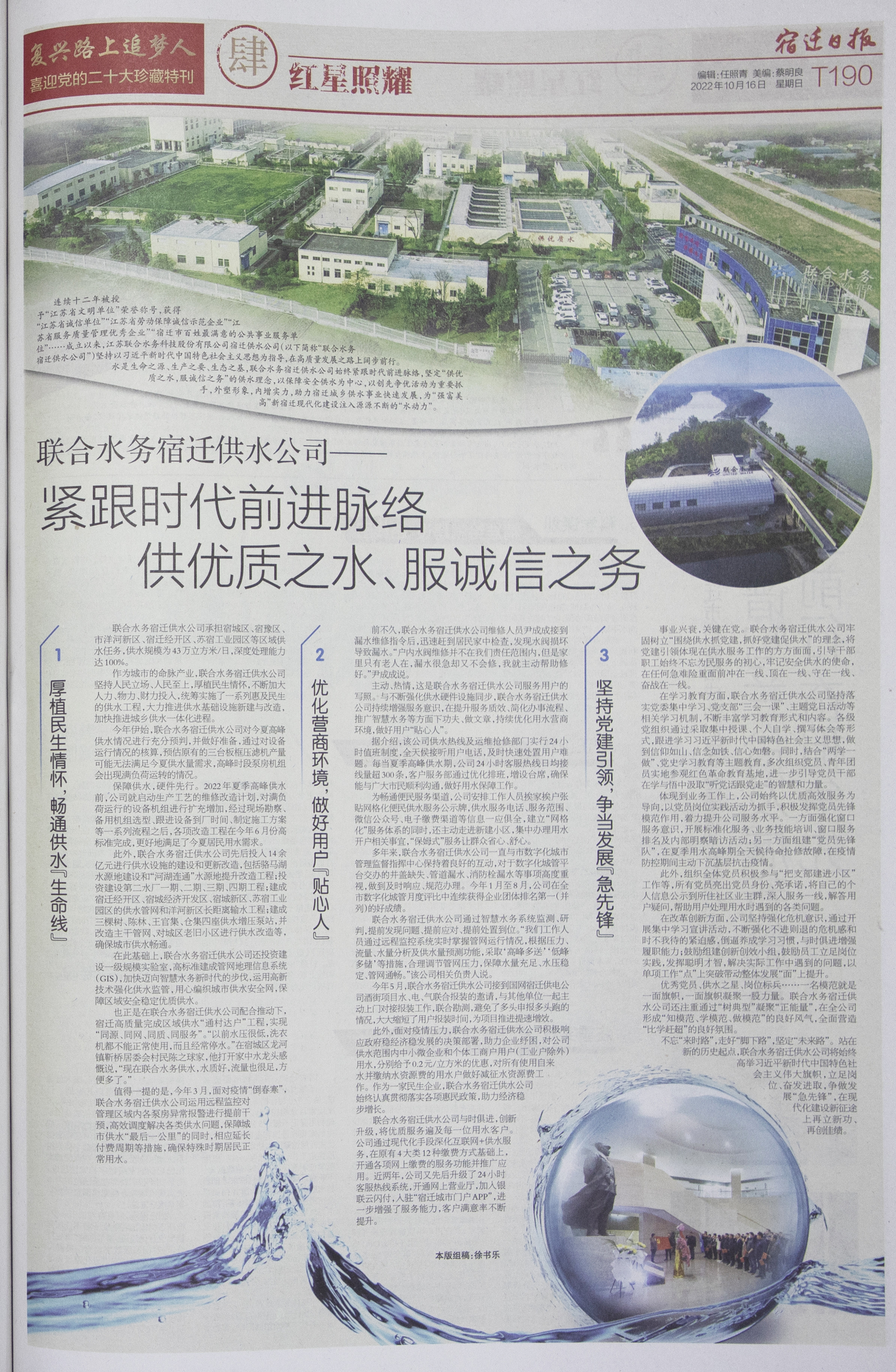 江蘇聯合水務科技股份有限公司榮登宿遷日報社喜迎黨的二十大珍藏特刊