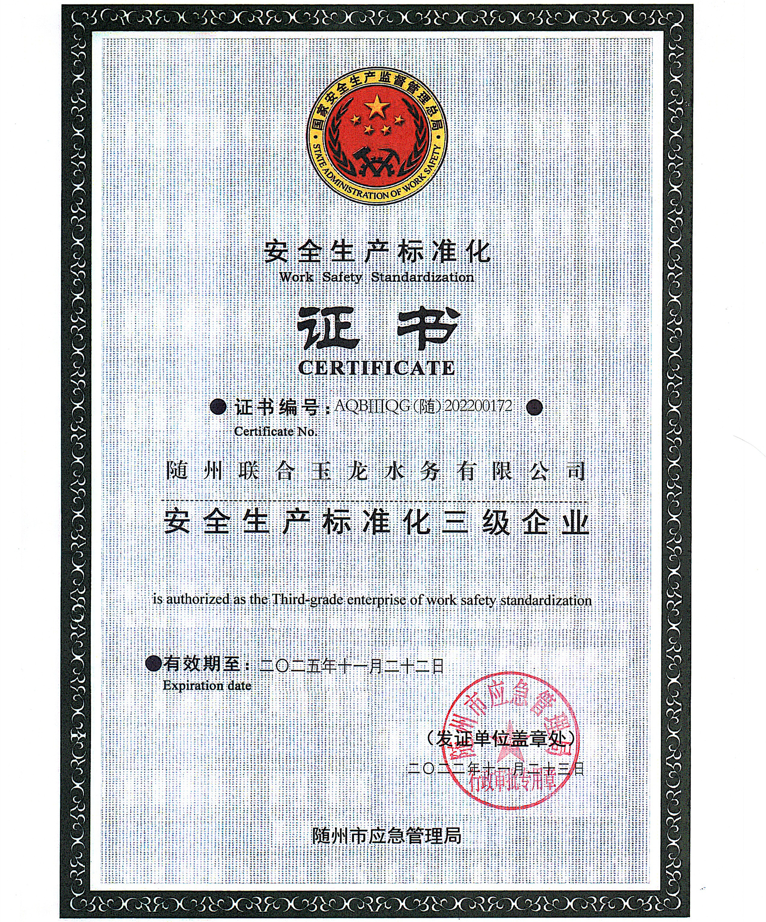 近日,隨州聯(lián)合玉龍水務(wù)有限公司正式獲得由隨州市應(yīng)急管理局頒發(fā)的“安全生產(chǎn)標(biāo)準(zhǔn)化三級(jí)企業(yè)證書(shū)”。