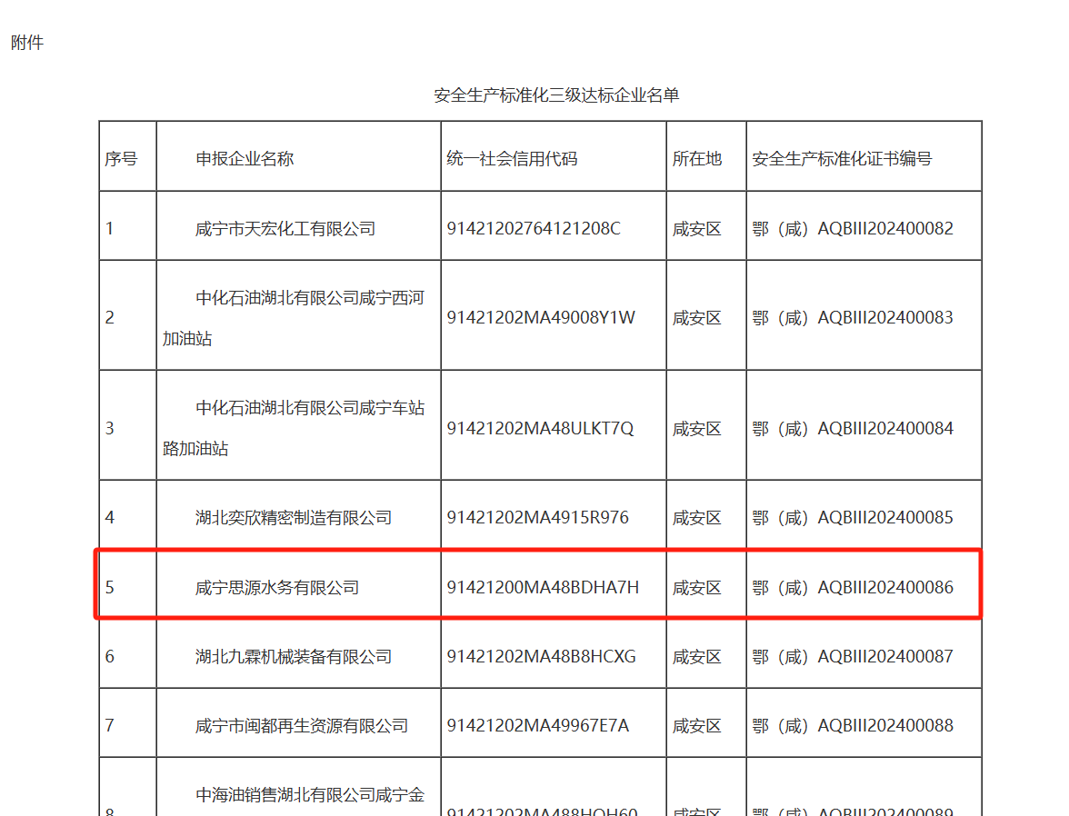 近日,聯合水務旗下子公司咸寧思源水務有限公司順利獲得了由咸寧市應急管理局頒發的“安全生產標準化三級企業”證書,此項榮譽的獲得,標志著公司安全生產管理工作得到充分肯定。
