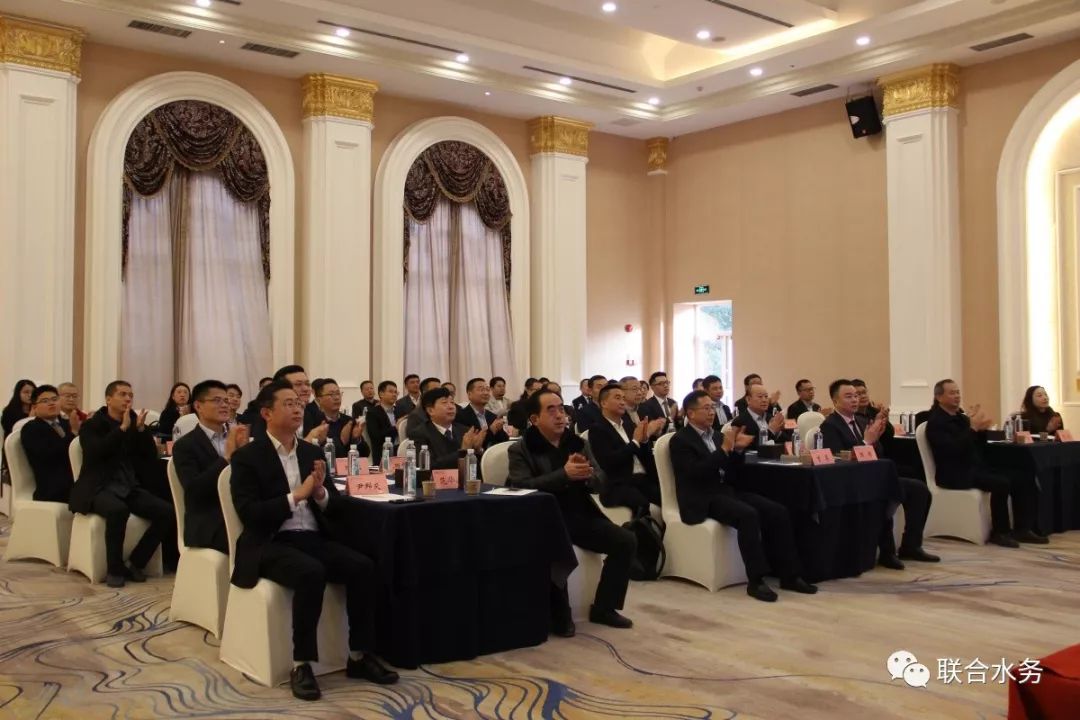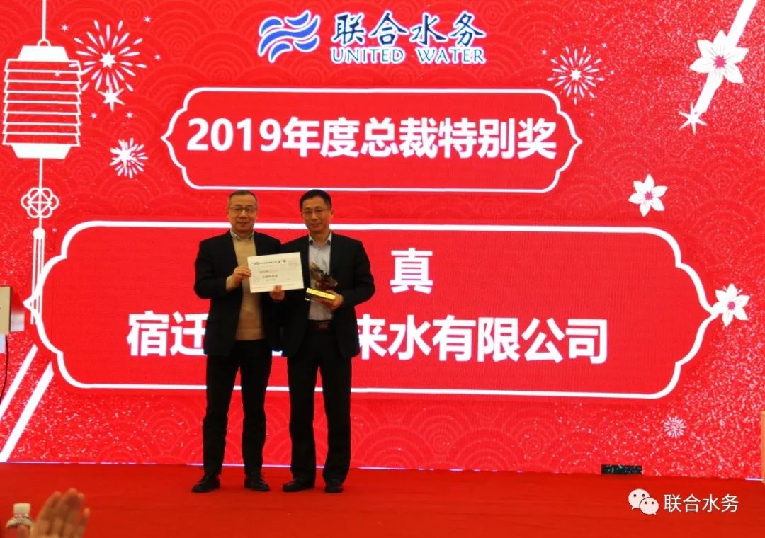聯合水務集團2020年年會現場 1月20日,聯合水務集團2020年年會在咸寧碧桂園鳳凰溫泉國際酒店召開,上海集團總部、各區域項目公司的帶頭人共計48名高層管理人員參加會議,總結2019、展望2020年,共商集團發展大計。會議由集團人力資源行政總經理楊麗霞女士主持。各項目公司、集團各運營模塊負責人分別作了2019年工作總結和新一年工作計劃匯報,集團高級副總裁劉猛先生、陳樵先生、副總裁羅斌先生根據匯報對各自負責的華中區、華南區、北方區的重點工作和挑戰做了分析與計劃,向著更高的目標,不斷奮進!2019年,宿遷銀控自來水有限公司為集團營收、人才輸出、新項目建設等做出了突出貢獻,總經理曾真先生摘得“2019年聯合水務集團總裁特別獎”桂冠。集團董事長兼總裁俞偉景先生為曾總頒獎。榮譽是激勵,更是鞭策。曾真總經理發表獲獎感言,感謝集團領導對宿遷公司的關懷、感謝宿遷公司所有同仁的共同努力、感謝各兄弟公司的鼎力支持,并表示將一如既往,緊跟集團發展步伐,當好排頭兵。