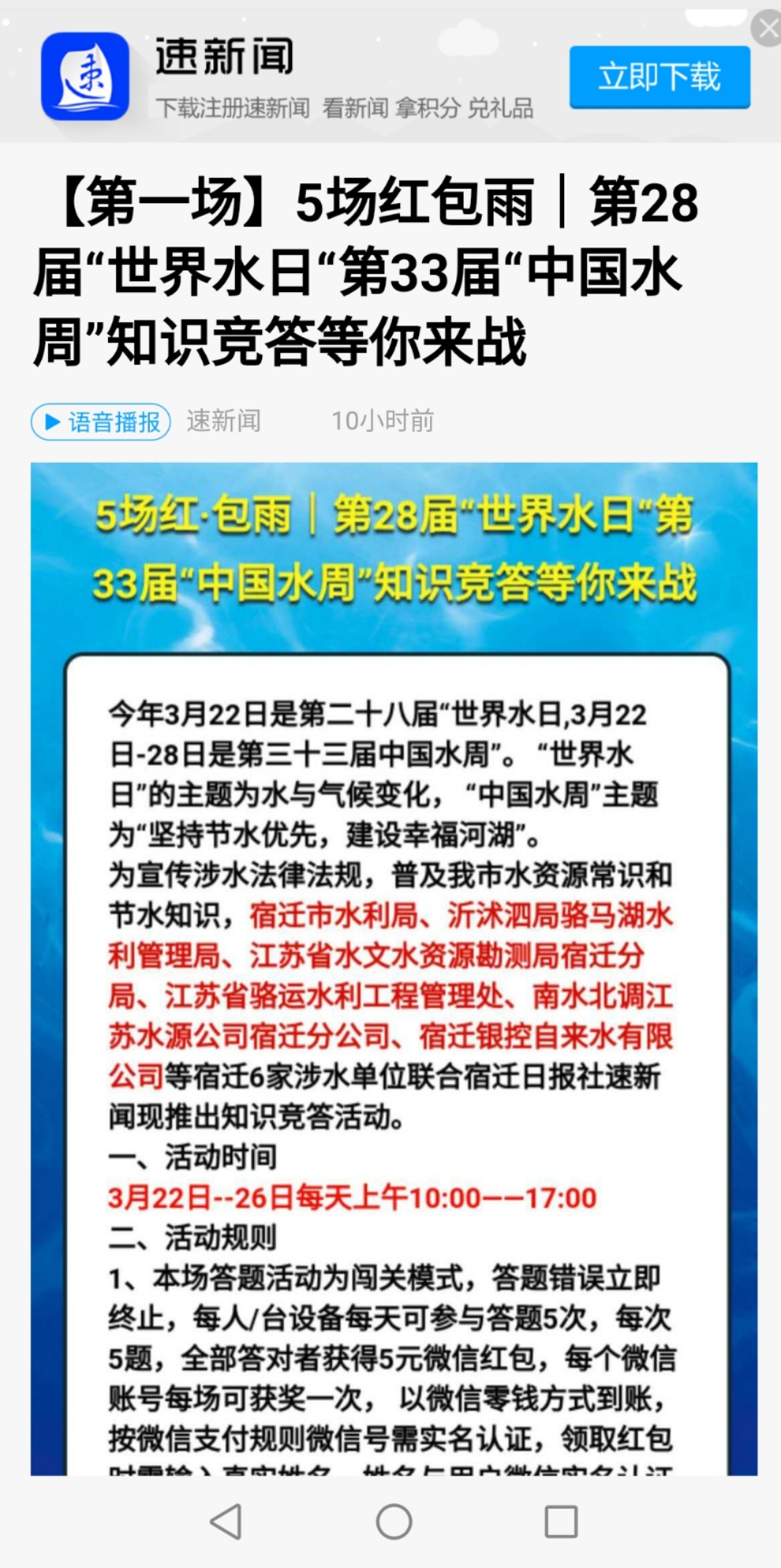 “汴水流,泗水流,流到瓜州古渡頭”。位于蘇北泗水畔的酒都宿遷以洋河美酒聞名大江南北乃至全世界。水是酒的命脈,好酒必有好水。宿遷,別稱“水城”,地處淮河、沂沭泗流域中下游,南臨洪澤湖,北接駱馬湖,著名的京杭大運(yùn)河穿境而過(guò)。在3月22日“世界水日“、3月22日—28日 “中國(guó)水周”到來(lái)之機(jī),聯(lián)合水務(wù)宿遷銀控自來(lái)水有限公司會(huì)同宿遷市水利局、沂沭泗局駱馬湖水利管理局、江蘇省水文水資源勘測(cè)局宿遷分局、南水北調(diào)江蘇水源公司宿遷分公司及宿遷日?qǐng)?bào)社共同舉辦系列宣傳活動(dòng),護(hù)衛(wèi)城市命脈,傳承生態(tài)愿景。一方水土養(yǎng)一方人, 節(jié)水、護(hù)水、愛(ài)水,全員行動(dòng)起來(lái),讓水韻宿遷更加大放光彩。 受疫情影響,今年宿遷市的“世界水日”、“中國(guó)水周”宣傳活動(dòng)采用線上方式扎實(shí)開(kāi)展,方式新穎且力度不減。經(jīng)過(guò)前期合辦單位的用心籌劃,圍繞今年國(guó)家水利部確定的“堅(jiān)持節(jié)水優(yōu)先 建設(shè)幸福河湖”的宣傳主題,系列宣傳活動(dòng)以別開(kāi)生面、匠心獨(dú)具的六大方式精彩呈現(xiàn),提高全市人民節(jié)水、護(hù)水、愛(ài)水意識(shí),形成全員參與、共創(chuàng)水生態(tài)美好家園的良好氛圍。 全民總動(dòng)員開(kāi)始啦!網(wǎng)絡(luò)倡議書(shū)簽名轉(zhuǎn)發(fā)活動(dòng),倡議書(shū)內(nèi)容豐富,既有宿遷市水資源知識(shí),還有節(jié)水小竅門呢,以百姓喜聞樂(lè)見(jiàn)的微信群、通過(guò)微信群、微信朋友圈方式進(jìn)行轉(zhuǎn)發(fā);網(wǎng)絡(luò)答題贏紅包活動(dòng),5場(chǎng)“紅包雨”,第28屆“世界水日”、第33屆“中國(guó)水周”知識(shí)全民競(jìng)技,寓教于樂(lè);意見(jiàn)建議征集活動(dòng),保護(hù)水資源,你獻(xiàn)計(jì),他獻(xiàn)策,水更清、城更美,民更樂(lè);網(wǎng)上攝影展活動(dòng),用鏡頭拍下最美水景,感受水鄉(xiāng)靈韻;水美文章征文活動(dòng),分享《童年的河》,一水一情,讓故鄉(xiāng)的水在心間流淌;彩印卡片+鮮花贈(zèng)送活動(dòng),水法宣傳不見(jiàn)面,投放在銀行、商場(chǎng)、醫(yī)院、公園、公交站臺(tái)等公共場(chǎng)所,全民知法、懂法、守法,愛(ài)護(hù)水源,人人有責(zé)。宿遷銀控自來(lái)水有限公司動(dòng)員公司全體員工積極參與各類活動(dòng),以實(shí)際行動(dòng)支持節(jié)水、護(hù)水、愛(ài)水行動(dòng)。 圖1:節(jié)水倡議書(shū)冠名單位