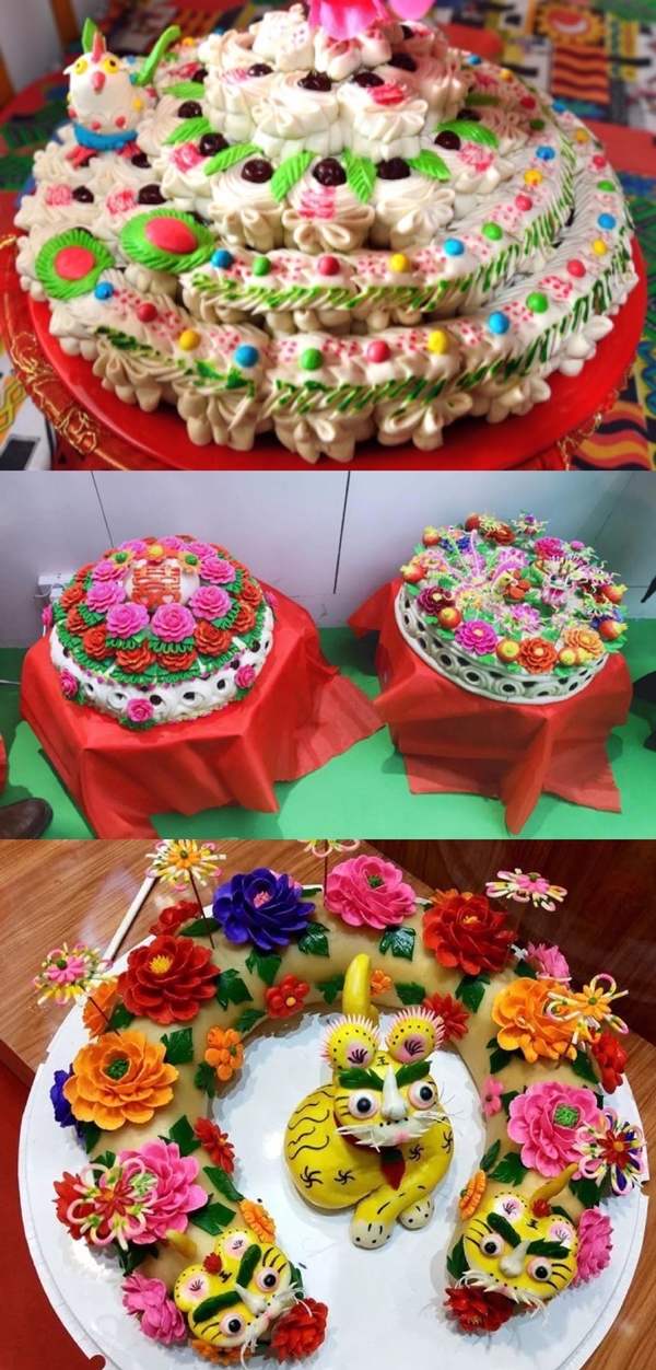古絳州,今天的新絳縣,一直是山西省重要的小麥、棉花產地。麥收時節(jié),家家戶戶收麥、晾曬,用上等的小麥磨成面粉。每逢年歲時節(jié)、絳州民間面塑形態(tài)各異、花色絢麗,又被當?shù)厝朔Q為“花饃”。因民俗而出現(xiàn)的面塑則代代相傳、生生不息,經過幾千年的傳承和經營,成為中國傳統(tǒng)文化和民間藝術的一部分。春節(jié),講究“大門獅子二門狗”,寓意鎮(zhèn)宅保平安;水缸旁放“雙頭魚”,寓意連年有余;糧倉放牛拉車和麥囤,寓意糧倉滿溢、日子越過越景氣;天地爺處祭棗山花饃、豬羊饃、節(jié)節(jié)高饃,寓意殺豬宰羊、生活一年比一年好;財神爺處祭元寶棗籃饃,寓意招財進寶。清明時節(jié),要捏豬頭饃、刺魚饃等祭祖掃墓,刺饃還得在墳頭滾一滾,意為已故祖先撓癢癢,盡兒孫之孝。端午節(jié),要捏老虎饃,“虎鎮(zhèn)五毒”,寓意去災辟邪。婚禮上,要捏龍鳳糕,插柏葉,紅繩系核桃、紅棗、花生、石榴、寓意夫妻百年好合、發(fā)家致富、生兒育女。新生兒滿月時,要蒸各式各樣的花、果造型的花饃、寓意開花結果。壽誕時、兒女要為長輩蒸壽桃饃。為母親拜壽時,插一組“七仙女拜壽”,為父親拜壽時,插一組“八仙慶壽”,顯示兒女孝心。在這片土地上,自漢代以來流傳千年的捏花饃風俗,早已深深融入絳州人們生活的方方面面。只要有誰家遇上紅白事,鄰居、親戚都會聚集在一起幫忙蒸制花饃。