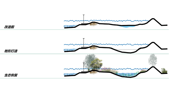 棲息地營造與恢復也是水生態修復的重要目的。通過微地形營造及草-灌木-喬木小生境的設計,可有效實現生物多樣性的恢復及棲息地的打造。如涉禽類主要于水深10-23 cm的空間內活動攝食,而游禽類主要于水深50-200 cm范圍內游憩活動,水深30 cm范圍內覓食,而不同的植被可為其提供產卵、棲息的隱蔽空間。