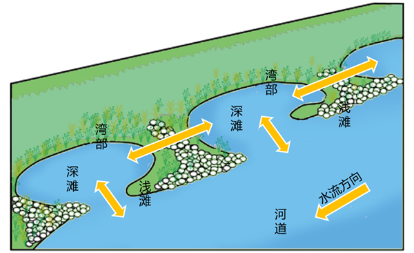歐洲的瑞士、德國早在1950年就開始實施近自然河川工程。參照這一思路,日本在1990年提出“多自然型河川”的路徑,并明確定義為“照顧到河川原有生物的生育環境,統籌兼顧自然景觀的保護和創建”。主要工程手段包括:巧妙利用復式斷面,將河灘綠地化、公園化,同時適應水位季節性變化;采用多樣化的自然型護坡,柔化岸線,提高岸線生態性;利用深灘、淺灘及灣部的營造,提高生境的復雜性,打造生物營棲空間;利用水位變動的河灘構建天然的濕地系統,修復河灘濕地環境。