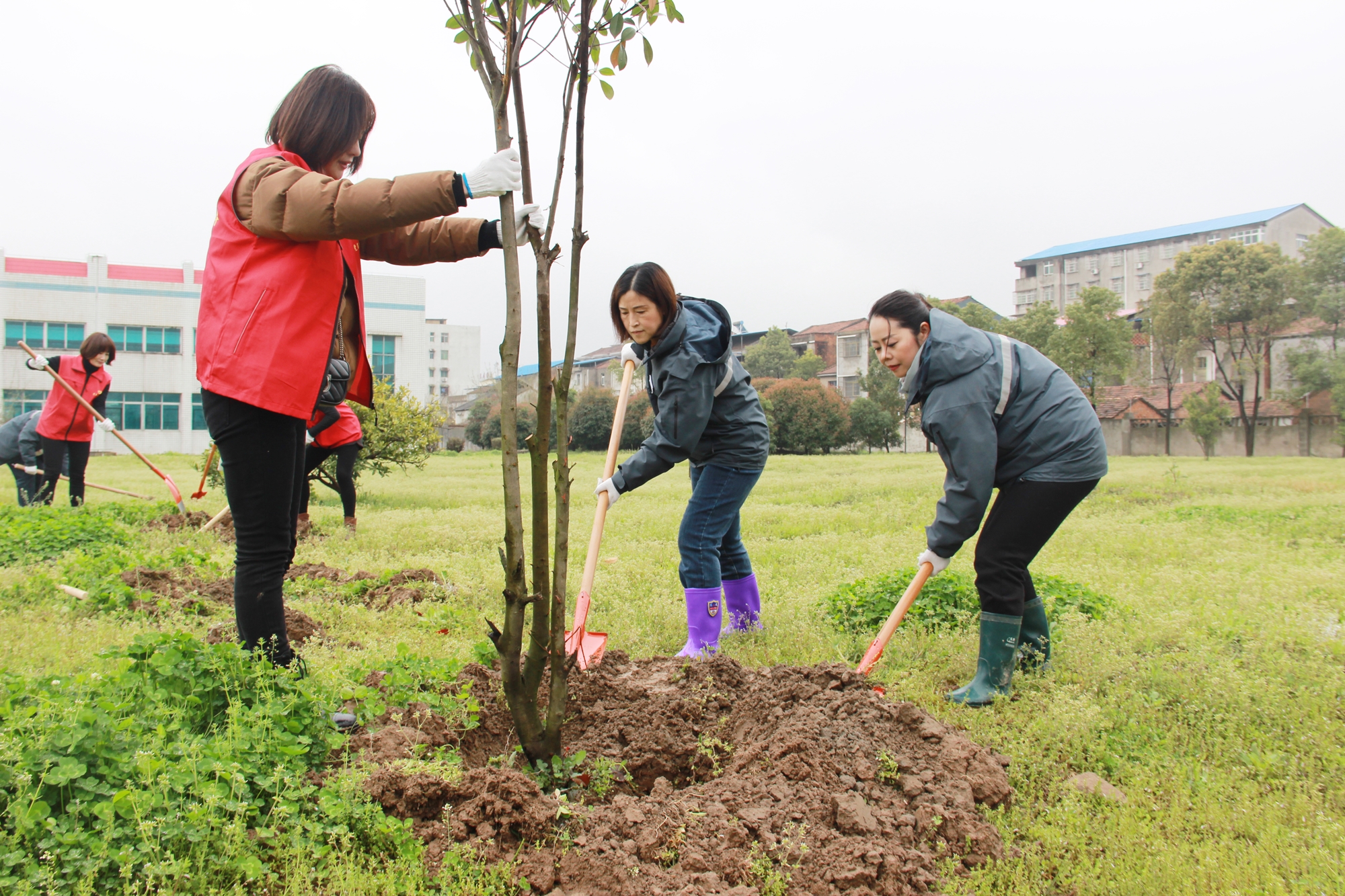 圖:植樹節合影 “人不負青山,青山定不負人”。新時代的主題篇章是人與自然共同和諧發展,生態興則文明興,只有留住綠水青山才能打造我們的金山銀山。植樹造林,利在當下,功在千秋。一顆小小的樹苗不僅僅代表著當下的環境綠化,更意味著碧水藍天的宏圖愿景。 11日上午,公司所有黨員及部分群眾代表乘坐大巴車來到公司下屬潘灣水廠進行植樹活動。習習春風略帶寒意,但眾人滿腔熱忱。大家紛紛拿起鐵鍬、鋤頭等工具,分工協作。搬運樹苗、樹坑定位、挖坑測量、栽樹扶直、回填澆水,每一個步驟都認真對待,不怕臟、不嫌累,所有人員一鼓作氣,團結協作,即使身上沾上了泥土,也一刻沒有停歇,好一幅熱火朝天的景象。經過一上午的勞作,100余顆小樹在水廠里“安家落戶”,伴著春風微微浮動,愿來年的這里枝繁葉茂,綠蓋如陰。
