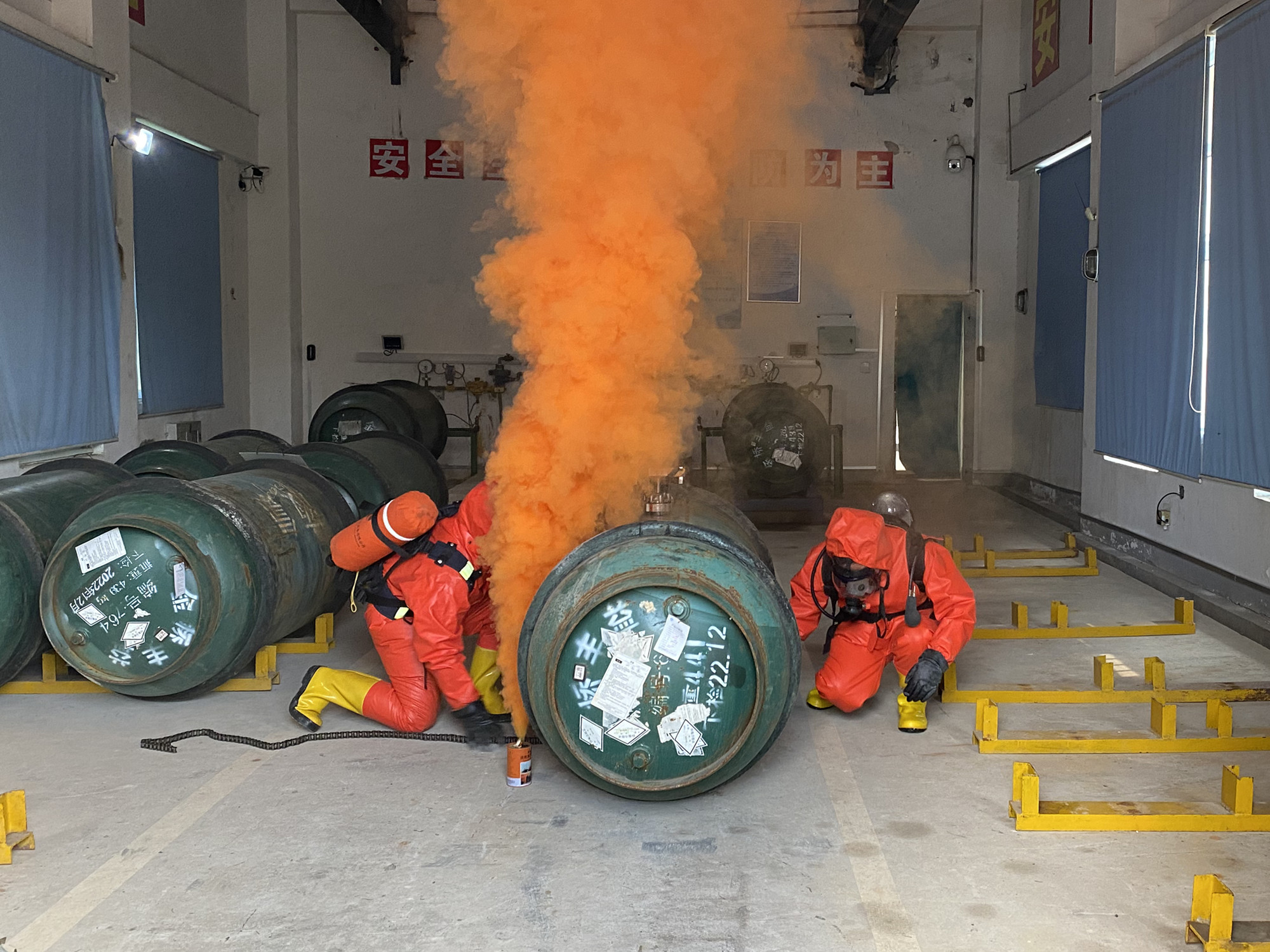 圖:現(xiàn)場處置組對鋼瓶進(jìn)行堵漏