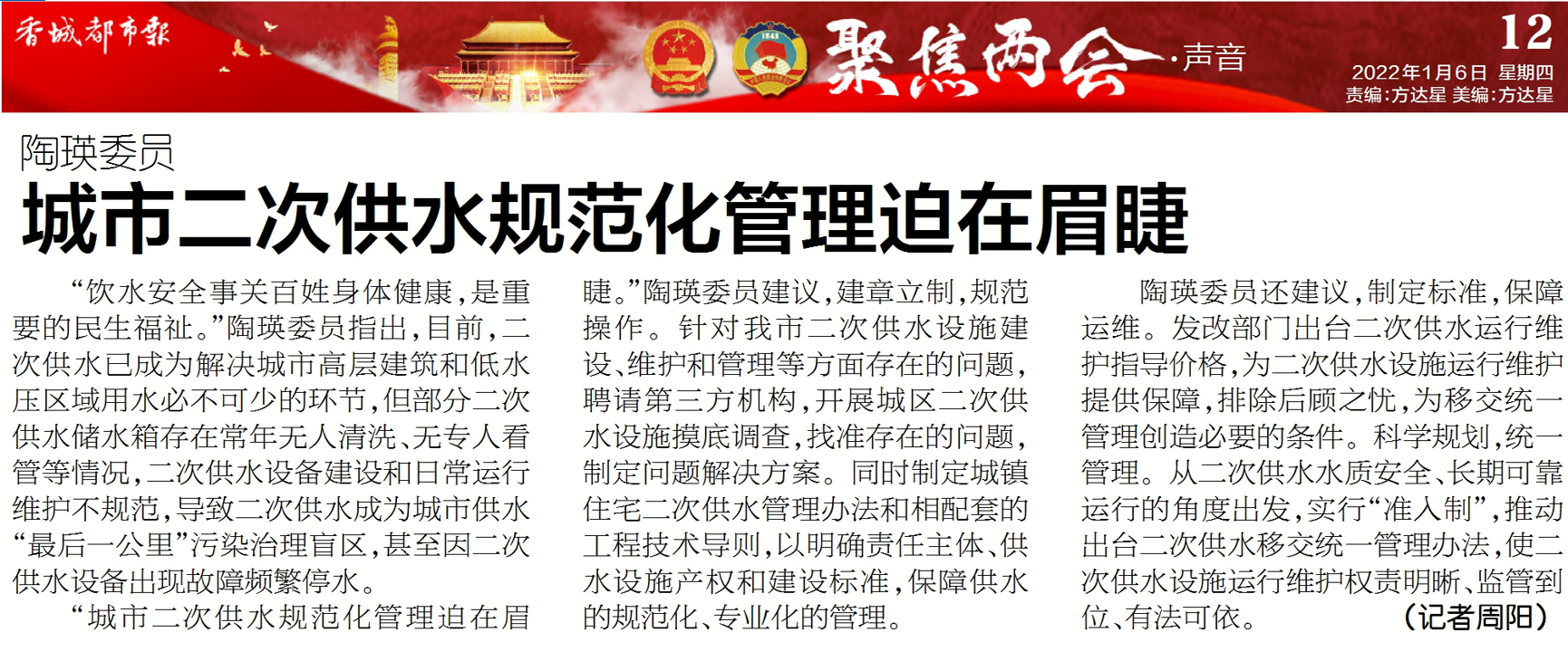 圖:香城都市報報道陶瑛委員建言獻策 作為政協委員,陶瑛表示深知自己所肩負的責任,她將切實把“人民政協為人民”的理念貫穿履職全過程,踔厲奮發、篤行不怠,在咸寧現代化建設進程中發出政協好聲音、展現政協新作為;帶領企業職工立足城市供水本職工作,堅持聯合水務“供優質之水,服誠信之務”的服務理念,創新發展,發揮優勢,以高度的責任感確保城市供水安全,甘做城市發展的基石,創造更多的社會效益和經濟效益,為咸寧高質量發展奉獻特有的水務力量。
