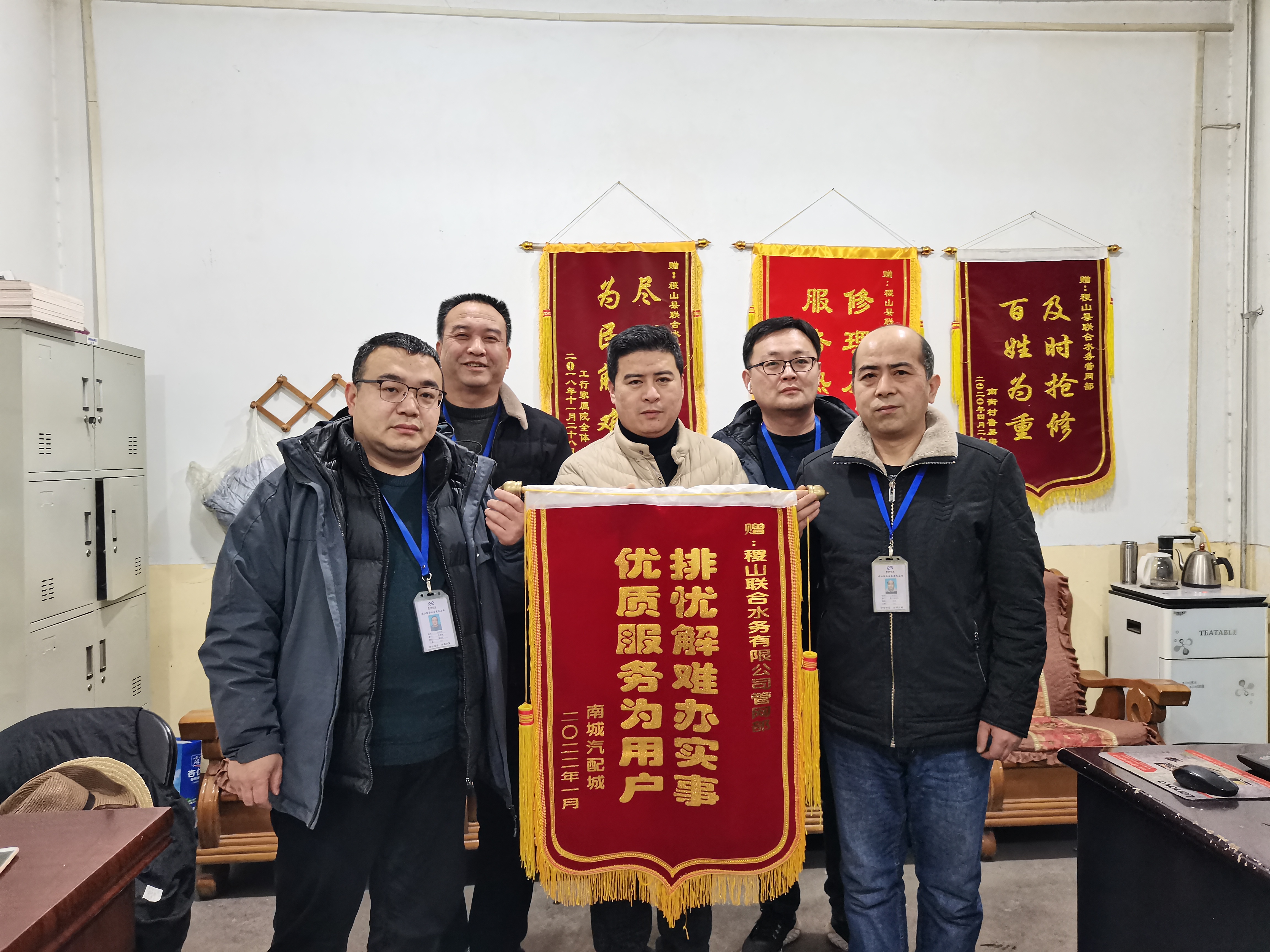 近日,稷山南城汽配廠及稷山縣鑫鋒金剛石工具有限公司的代表來到稷山聯合水務有限公司,分別送上兩面寫有“排憂解難辦實事,優質服務為用戶”、“心系小微,情暖企業”的致謝錦旗,并向稷山聯合水務表示衷心的感謝,對公司管網部高效解決用戶供水問題表示高度肯定。