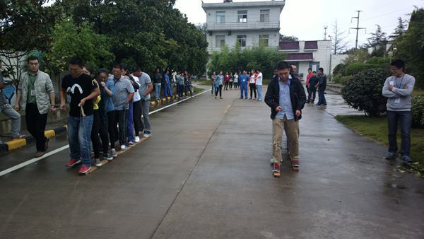 9月30日下午,舉辦的是“無軌列車”活動(dòng)。該項(xiàng)團(tuán)體活動(dòng)要求每組4男4女搭配,各組組員的兩腳必須分站在由兩塊木板制成的行走板上,協(xié)調(diào)一致前行,在比賽過程中任意隊(duì)員任意部位與地面有接觸,即被警告1次,同時(shí)在總成績(jī)上增加10秒,警告3次取消比賽資格。賽道全長(zhǎng)50米,含下坡路段,成績(jī)匯總后,以完成比賽用時(shí)最短的一組獲勝。最終,行政財(cái)務(wù)聯(lián)隊(duì)以1分48秒的成績(jī)獲得第一,工程聯(lián)隊(duì)獲得第二,洋河聯(lián)隊(duì)、污水客服聯(lián)隊(duì)并列第三。