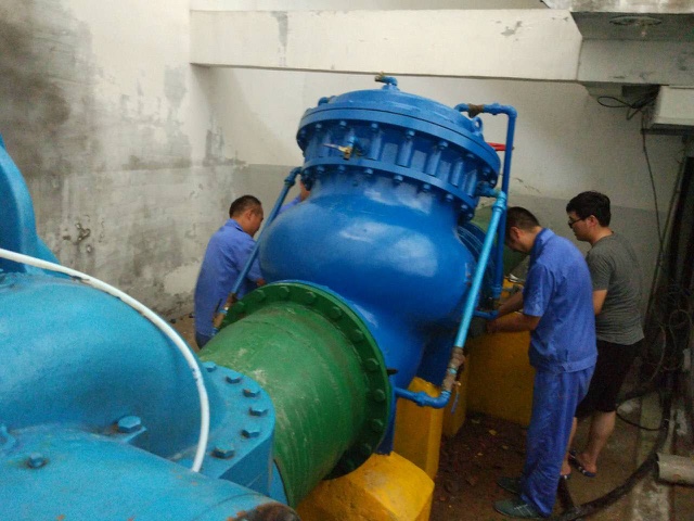 9點05分左右,駱馬湖一號機組出水端伸縮器出現漏水狀況,且水量較大、水壓高,需要停機進行檢修。即使關閉出水閥門,仍有漏水現象,只有切換備用水源才能予以維修。經請示,上午10點10分左右完成了水源的切換工作,機電部門人員便開始對伸縮器和閥門進行拆解維修。此時正值高溫時段,泵站內由于電機工作放熱,溫度更是逼近39攝氏度,在連續奮戰了7個小時之后,終于將損壞的伸縮器更換完畢,完成了閥門的修復工作。此時大家都已經體力透支,短暫的休息之后,緊接著又趕往運河泵站開關閥門和機組,將水源切換回來,晚上8點,整場維修終于結束。